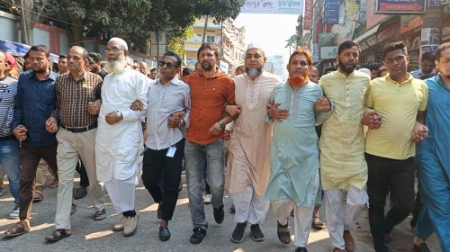অবৈধ ফুটপাত দখল ও হামলার প্রতিবাদে কিশোরগঞ্জে ব্যবসায়ীদের শাটডাউন
